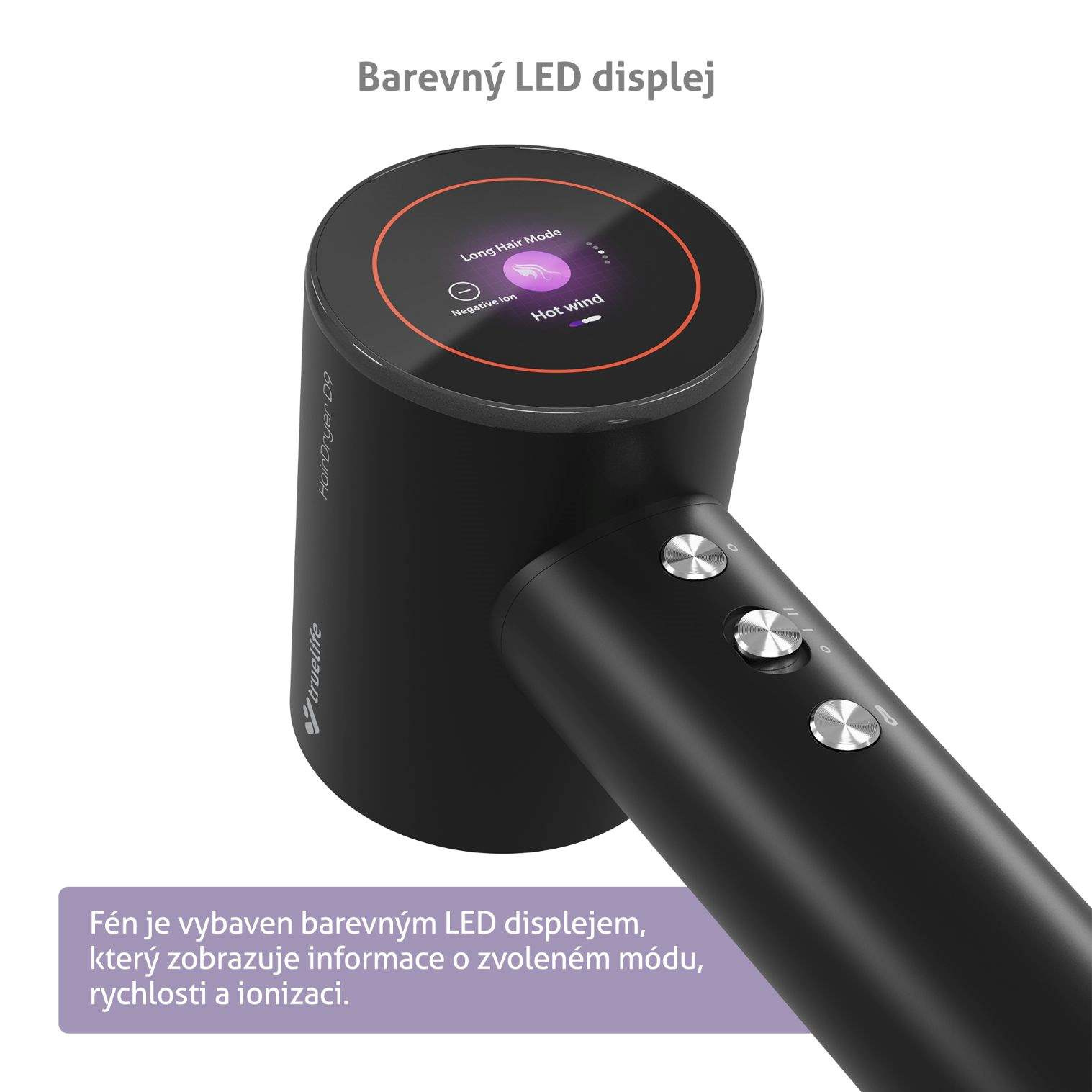 Fén je vybavený okrúhlym farebným displejom LED, ktorý prehľadne zobrazuje informácie o procese sušenia vlasov – zvolený režim, rýchlosť a ionizáciu.