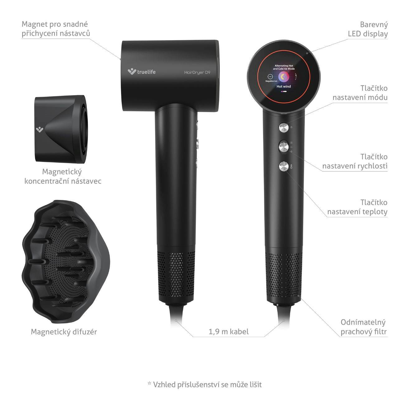 TrueLife HairDryer D9 patrí ku špičke vo svojej kategórii. Jeho ionizátor s technológiou TrueLife UltraIonic® produkuje až 200 miliónov záporných iónov pre hladšie a zdravšie vlasy. Vlhkosť sa z dlhých a polodlhých vlasov odparí rýchlejšie a pri nižšej teplote. Šetrnosť a rýchlosť sušenia je tiež zásluhou motora s technológiou TrueLife UltraFlow®, ktorý dosahuje až 110 000 otáčok za minútu. Praktickou výbavou fénu je okrúhly farebný LED displej, ktorý prehľadne zobrazuje všetky informácie o fúkaní, t. j. zvolený režim, rýchlosť alebo ionizáciu.