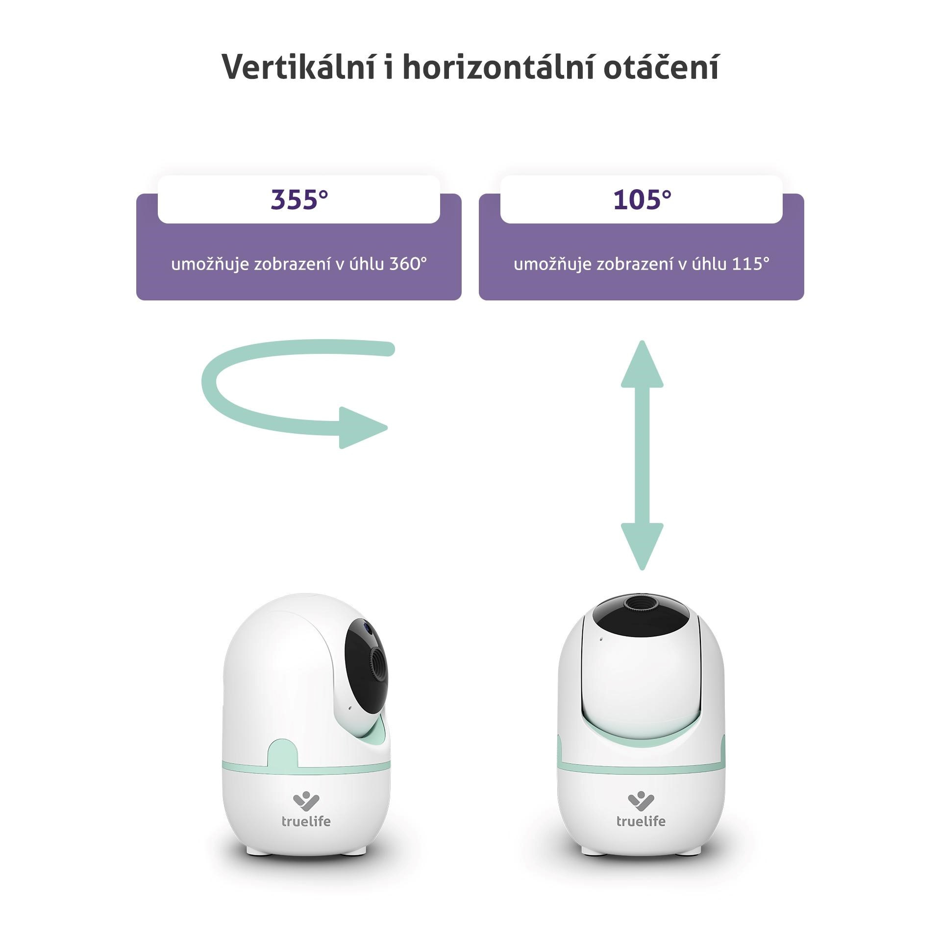 Kamera opatrovateľky sa vie otáčať horizontálne o 355° a vertikálne o 105°. Vďaka širokému pozorovaciemu uhlu ale umožní vidieť celých 360° horizontálne a 115° vertikálne. Rozhodne vám teda nič neunikne, dohliadnete do každého zákutia.