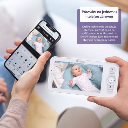 Prostredníctvom duálnej technológie je možné pestúnku párovať na rodičovskú jednotku aj smartfón. Pestúnku je teda možné použiť v prostredí domova s rodičovskou jednotkou. Pokiaľ je pre vás ale práve pohodlnejšie sledovať dieťa z iného miesta, vďaka aplikácii TrueLife Smart, ktorá je kompletne v slovenskom jazyku, získate neobmedzený dosah a v aplikácii tak môžete všetko sledovať odkiaľ chcete. Praktické je zdieľanie účtu s viacerými členmi domácnosti, aby mal o dieťati prehľad aj partner alebo napríklad prarodičia. Počet používateľov nie je obmedzený. Nemusíte sa však báť nepovolaných pozorovateľov. Aplikácia využíva päťvrstvovú šifrovaciu technológiu zaisťujúcu bezpečnosť smart zariadení, bez toho aby hrozil únik informácií.