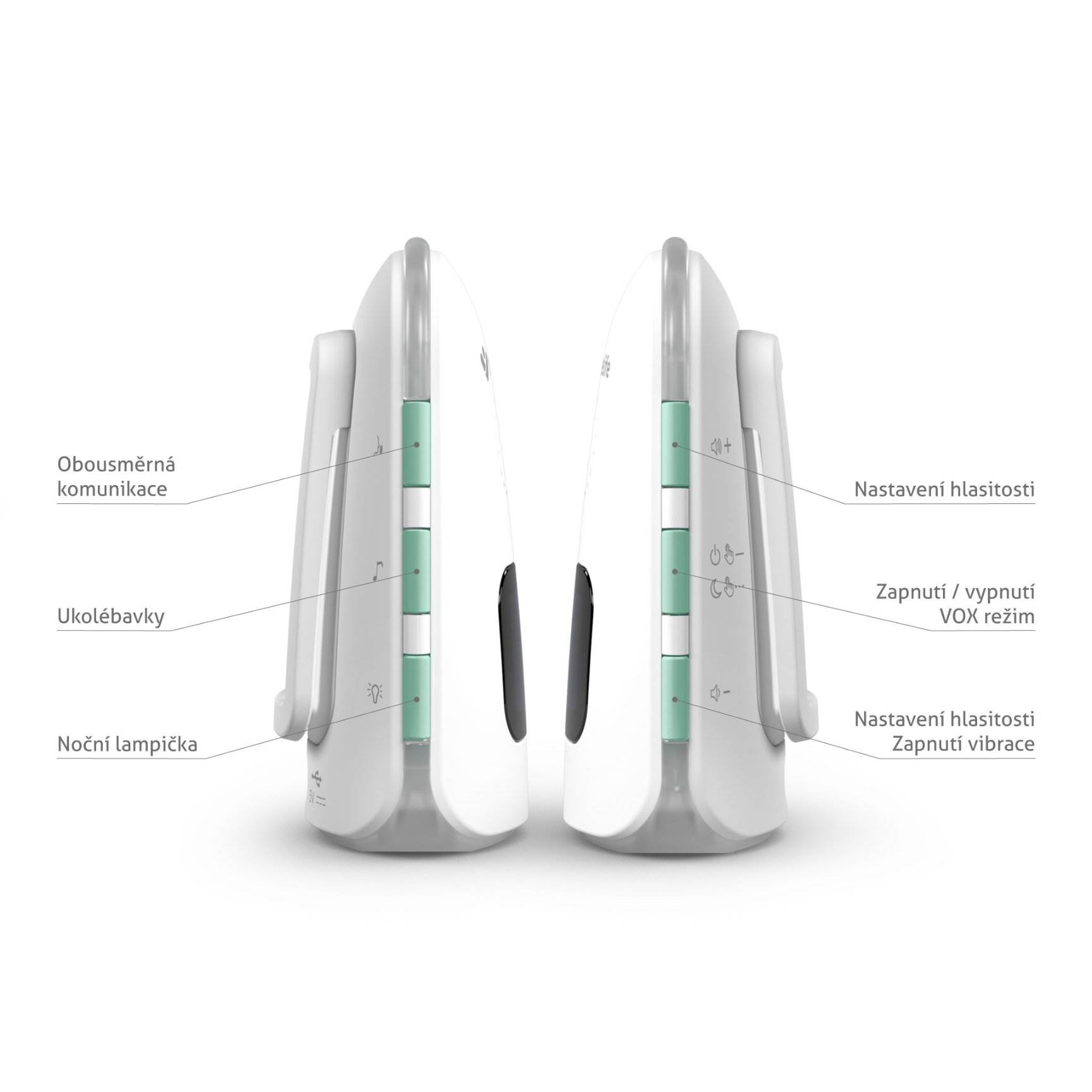 Rodičovská jednotka je vybavená LCD displejom pre rýchly prehľad a detektorom indikujúcim stratu signálu, slabú batériu alebo nízku či vysokú teplotu v miestnosti. Digitálny prenos signálu je zabezpečený, nemusíte si teda robiť starosti, že by ho niekto zachytil. Rodičovskú jednotku si pomocou praktickej spony pripevníte napríklad k opasku. Pokiaľ by sa ale stalo, že ju niekde odložíte, pomocou detskej jednotky a zvukového lokátoru rodičovskú jednotku opäť objavíte. Spolu s detskou jednotkou je možné spárovať až dve rodičovské jednotky.