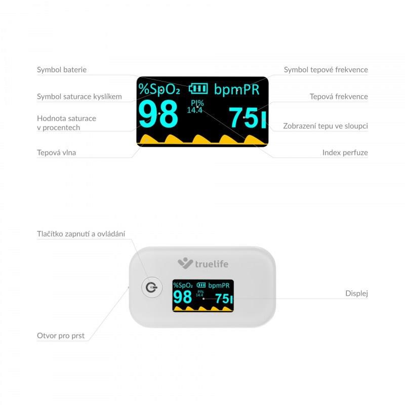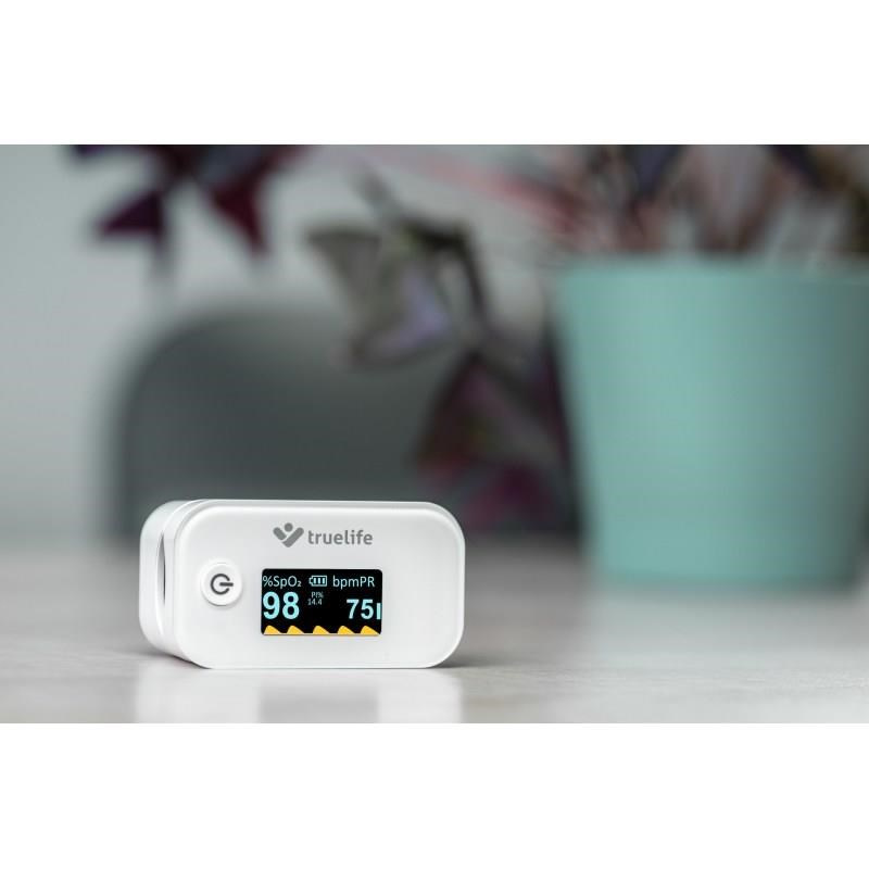 Pulzný oxymeter Truelife X3 je malý praktický prístroj, s ktorým ľahko, okamžite a bezbolestne zistíte saturáciu krvného hemoglobínu kyslíkom, tepovú frekvenciu a perfúzny index. Malý prístroj, ktorý jednoducho umiestnite na prst, je ideálnym pomocníkom pre osoby s respiračnými ochoreniami, srdcovými problémami, astmatici, ale aj vrcholových športovcov. Oxymeter je vybavený OLED displejom, ktorý zobrazuje namerané hodnoty. Displej ponúka nastaviteľnú intenzitu jasu a 6 režimov zobrazenia meraných hodnôt. Oxymeter TrueLife X3 spoľahlivo zmeria váš tep aj saturáciu krvi kyslíkom v pohodlí domova, bez nutnosti návštevy lekára a bez bolesti.