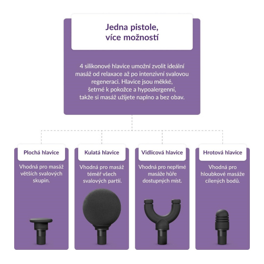 Každý sval si zaslúži špeciálnu starostlivosť, preto je masážna pištoľ TrueLife RelaxGun G1 vybavená štyrmi vymeniteľnými silikónovými hlavicami. Guľatá hlavica je univerzálnou voľbou pre veľké svalové partie a využijete ju ako pred tréningom, tak aj po ňom. Plochá hlavica vďaka svojmu rovnomernému tlaku skvele poslúži na jemné uvoľnenie svalov v blízkosti kĺbov a kostí. Pre šiju, chrbticu alebo lýtka zvoľte vidlicovú hlavicu, ktorá je ideálna na nepriamu masáž hlbších vrstiev svalov. Naopak pri potrebe presnej bodovej masáže citlivých alebo ťažko dostupných miest využijete hrotovú hlavicu.