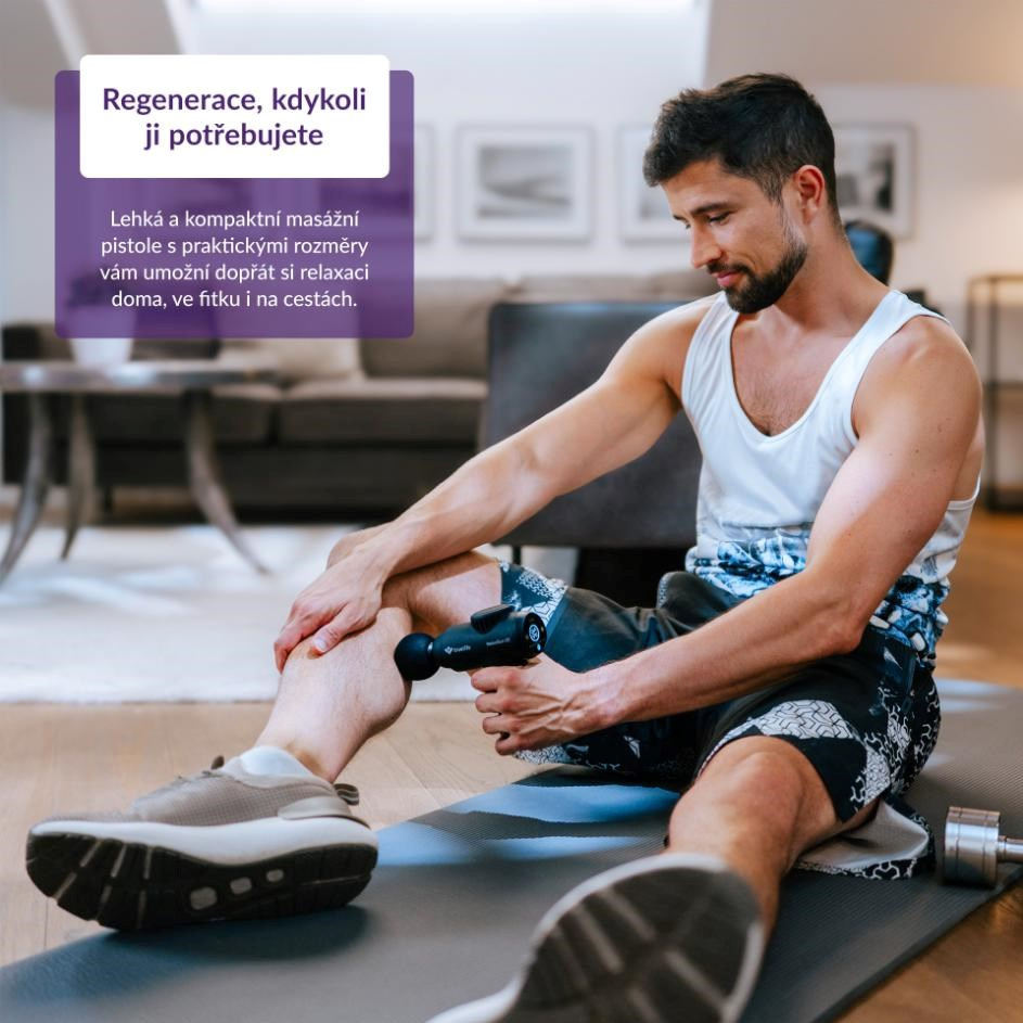 Masážna pištoľ váži len 440 g a vďaka svojmu kompaktnému dizajnu ju ľahko vezmete na cesty, do kabelky alebo do fitka. Súčasťou balenia je praktický obal.