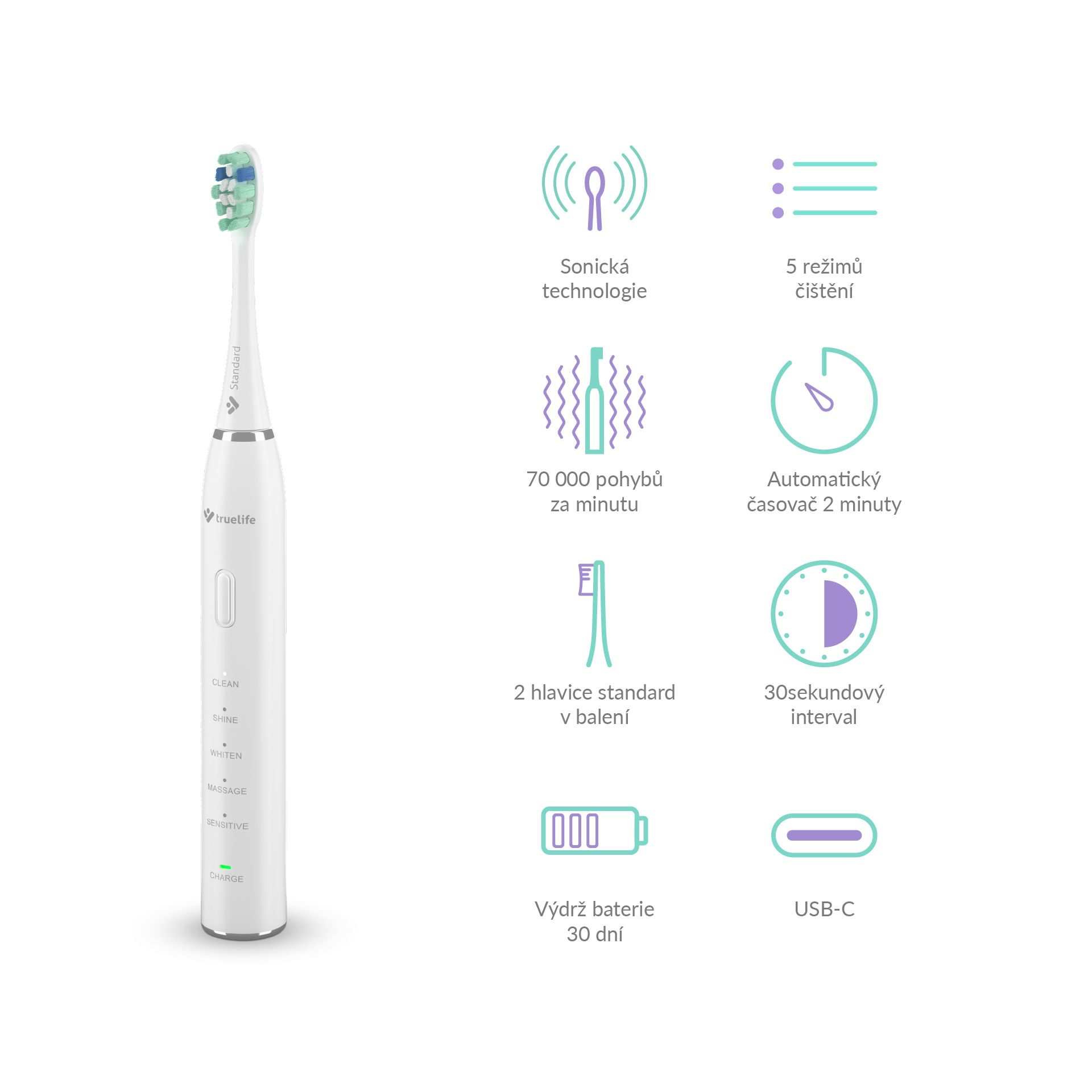 Krásny úsmev začína správnou každodennou starostlivosťou o zuby. Skvelým cenovo dostupným a výkonným pomocníkom je sonická kefka TrueLife SonicBrush Clean30 so sonickou technológiou SonicTrue®. Jej 70 000 pohybov za minútu zuby dokonale vyčistí a ide ešte ďalej vďaka možnosti výberu z 5 režimov čistenia. Clean vyčistí zuby a odstráni zubný povlak, Shine zbaví zuby škvŕn od čaju a kávy, na vybielenie slúži režim Whiten, ďasnám urobí dobre Massage a pre citlivé zuby a ďasná je určený režim Sensitive. Balenie obsahuje 2 hlavice Standard, ktorých modré štetinky zhruba po troch mesiacoch zbelejú. Tým indikujú, že je potrebné hlavicu vymeniť. Na jedno nabitie vydrží kefka 30 dní, potom ju iba stačí dobiť pomocou priloženého USB-C kábla.