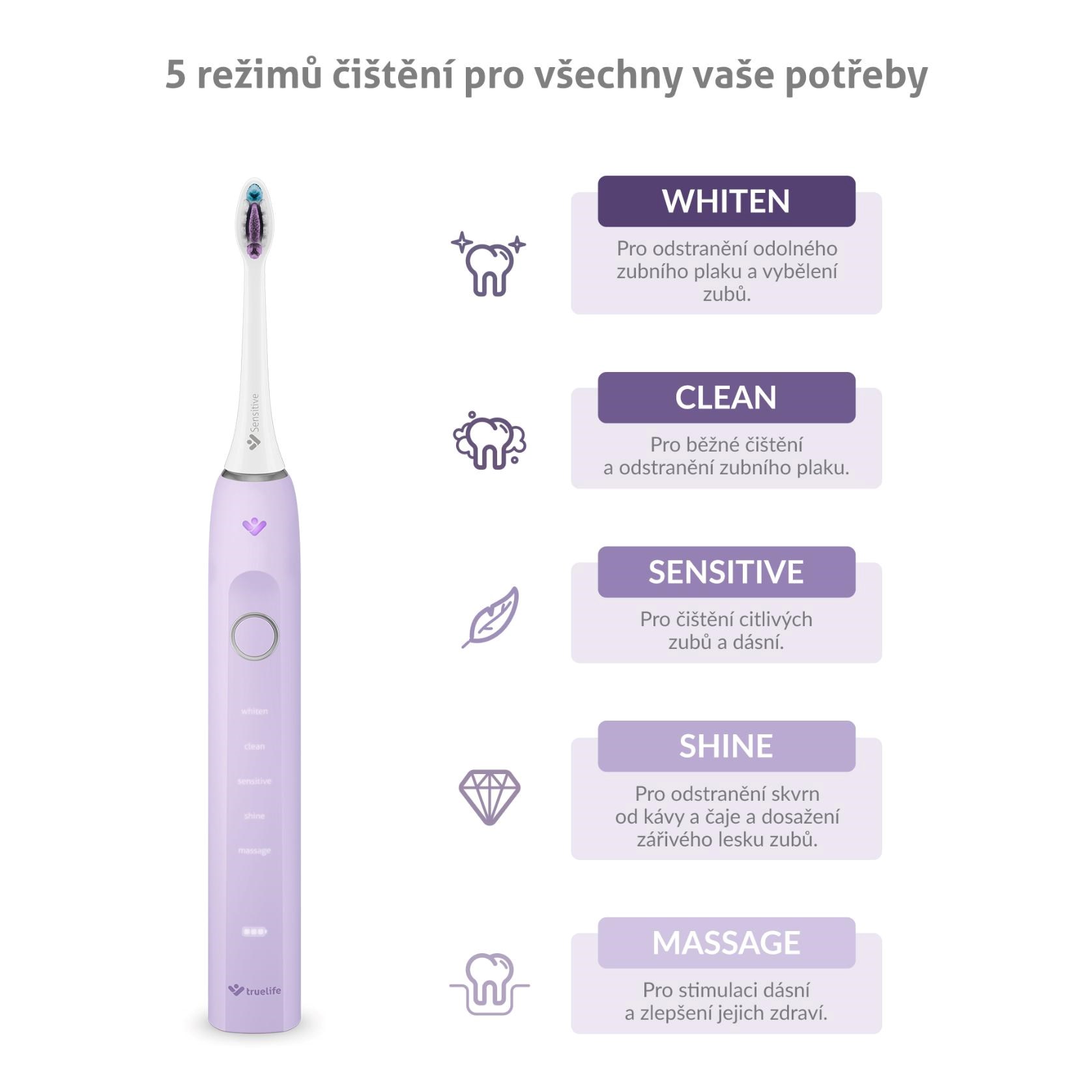 Stačí jeden kefka na vyriešenie rôznych problémov. Balenie sonickej kefky TrueLife SonicBrush Clean70 UV obsahuje 2 hlavice. Standard na každodenné čistenie a Sensitive s extra jemnými štetinkami pre citlivé zuby. Pridať je možné tiež hlavicu Whiten na bielenie zubov. Hlavice však nie sú jedinými pomocníkmi pri starostlivosti o zuby a ďasná, svoju prácu zastanú aj 5 režimov čistenia. Režim Clean zvládne bežné čistenie, režim Sensitive je určený pre citlivé zuby a ďasná, na žiarivý lesk a odstránenie škvŕn od čaju a kávy je určený režim Shine, režim Whiten odstraňuje odolný zubný plak a bieli zuby a ak chcete zlepšiť zdravie ďasien a ich stimuláciu, je vhodný režim Massage.