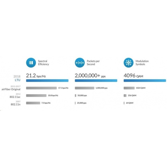 aF-5XHD je v súčasnosti najvýkonnejšie a najlepšie vybavené zariadenie airFiber od spoločnosti Ubiquiti Networks. Revolučný integrovaný obvod airFiber LTU dokáže spracovať viac ako 2 milióny paketov za sekundu pri reálnej rýchlosti prenosu dát 1 Gb/s+ (TDD) v bezlicenčnom pásme 5 GHz pri 1024QAM (plánovaný firmvér by mal podporovať až 4096QAM s ešte vyššou priepustnosťou). Medzi ďalšie kľúčové funkcie patrí 2x Gigabit LAN, pričom jeden port je určený len na správu, synchronizácia času prostredníctvom GPS, špecializovaný spektrálny analyzátor, vysoká odolnosť voči vode (IP67) a nastaviteľná šírka kanálov 10/20/30/40/50/60/80 a 100 MHz. AirFiber 5XHD je vodotesný a ideálny do všetkých poveternostných podmienok vďaka veľmi dobrej konštrukcii a priloženému gumovému adaptéru.