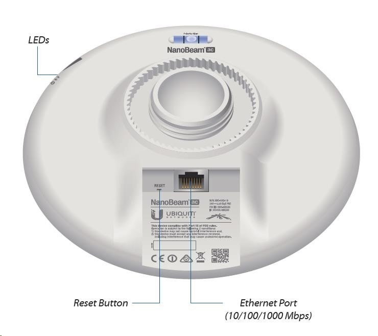 vnútri NanoBeamu sa nachádza výkonný procesor MIPS Atheros 74KC s frekvenciou 720 MHz, na ktorý nadväzuje 128 MB operačnej pamäte typu DDR2 a 8 MB pamäte Flash. Sieťový port podporuje 10/100/1000 Ethernet a možno ho použiť na napájanie jednotky pomocou dodaného pasívneho gigabitového adaptéra PoE 24V/0,5A (aktívne PoE podľa 802.3af nie je podporovaný).