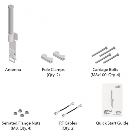 ide o robustné 10dbi všesmerové anténne riešenie pre prístupové body pracujúce v pásme 5 GHz a využívajúce štandard 802.11n v kombinácii s technológiou MIMO. Anténa má dva konektory RSMA typu žena. Súčasťou dodávky sú dva vodotesné pigtaily RSMA na pripojenie k jednotke Rocket M5, držiak pre túto jednotku a montážna súprava na stožiar, pozri. obr.