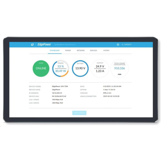 na pripojenie napájaných zariadení sú k dispozícii 2 ethernetové porty s pasívnym 54V PoE Out, rýchlosťou 100 Mb/s a 1 výstup na svorkovnicu. EdgePower možno spravovať prostredníctvom aplikácie UNMS alebo vlastného webového rozhrania. Samozrejme, k dispozícii je podpora protokolu SNMP.