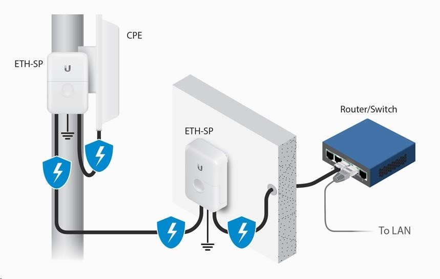 hoci všetky jednotky UBNT majú integrovanú ochranu proti ESD, ETH-SP možno použiť ako dodatočnú vrstvu ochrany, čo sa veľmi odporúča. Možnosť poškodenia v dôsledku ESD je tak výrazne eliminovaná.