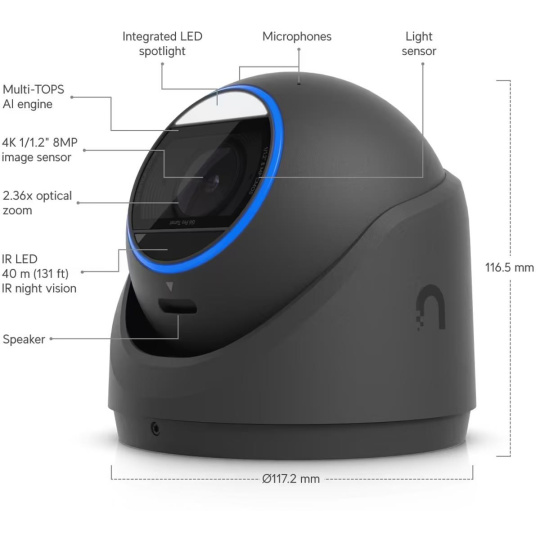 Popis produktu Ubiquiti UniFi IP turret hybrid kamera UVC-G6-Pro-Turret-W disponuje 8MP snímačem (3840 x 2160 px) při 30fps, variofokálním objektivem (5,85mm-13,8mm), kombinovaným IR/bílé světlo přísvitem pro noční vidění na vzdálenost až 40m, krytím IP66 a IK4 a vestavěnými mikrofony. Do sítě lze kameru připojit pomocí 1Gbit LAN s podporou napájení přes PoE+ s maximální spotřebou 15W. Klíčové vlastnosti • 8MP 30fps video (3840 x 2160 px) • Pokročilá AI detekce - odfiltrování falešných poplachů a spolehlivá detekce osob a vozidel • Hybridní Smart přísvit - IR/LED přísvit s dosahem 40m • Podporuje lokální záznam na microSD kartu nebo na NAS • Spravováno prostřednictvím UniFi Protect • IP66 kryt odolný proti povětrnostním vlivům • IK4 odolnost vůči vandalům • Napájení pomocí 802.3at 42.5-57V PoE+ Obsah balení • Zařízení • Šroubky, hmoždinky, nářadí • Držák na zeď/strop Technické parametry Kamera Zoom (optický):2,36x Typ objektivu:Varifokální - motorický Objektiv [mm]:5,85 až 13,8 (nastavitelný) Přísvit:Hybridní IR / bílé světlo Dosah přísvitu [m]:40 Pozorovací úhel [°]:45,5 až 113,8 Režim den/noc:Hybridní IR cut filtr / barevný Obrazový senzor ["]:1/1.2 Obraz Rozlišení:8MP Max. rozlišení [pixely]:3840 x 2160 (4K UHD) Konektory a rozhraní Slot na paměťové karty:microSD Audio:2 Mikrofony, Reproduktor Rychlost LAN:(1) 10/100/1000Mbps Napájení Napájení přes PoE:802.3at, 42 .. 57V DC Typ napájení:PoE Max. spotřeba energie [W]:15 Fyzické charakteristiky Stupeň krytí:IP66 Použití:Venkovní Antivandal (ochrana proti nárazu):IK4 Tlačítka:Reset Provozní teplota [°C]:-30 až 50 Hmotnost [g]:1200 Šířka [mm]:117 Výška [mm]:117 Hloubka [mm]:117 Barva:Bílá Obecné Kamerová řada:UniFi Protect Technologie a vymoženosti:Čtení SPZ, Face detection, Detekce vozidla, Multi-TOPS AI Engine.