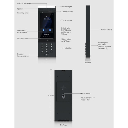 Popis produktu UA-Intercom je zbrusu nový špičkový video interkom vhodný jak pro vnitřní, tak venkovní použití (operační teplota -30°C až +60°C), ideální pro řízení vstupů do rezidenčních i komerčních objektů. Interkom kombinuje robustní a odolnou konstrukci s pokročilými funkcemi pro zajištění bezpečného a pohodlného přístupu. Tento interkom umožňuje odemčení přístupu pomocí různých metod, - NFC kartou, mobilní aplikací UniFi Identity, PIN kódem nebo QR kódem, což umožňuje flexibilitu výběru preferované metody. Díky vestavěnému adresáři a funkci zvonku mohou návštěvy snadno komunikovat s uživateli, kteří jim mohou umožnit vstup. Jeden interkom lze také propojit s více domácími video telefony, takže ani instalace v bytových domech není překážkou. Jeho snadná instalace a napájení pomocí Power over Ethernet (PoE) prostřednictvím UA-Hub umožňují implementaci v existujících i nových systémech. UA-Intercom je navržen tak, aby splňoval náročné požadavky na spolehlivost a výkon, poskytující bezpečnost a pohodlí pro uživatele. Vylepšete svůj systém kontroly přístupu a komunikace s UA-Intercom od Ubiquiti - spojení bezpečnosti, pohodlí a moderní technologie ve vaší budově. Klíčové vlastnosti Odemykání pomocí NFC karty, UnFI Identity mobilní aplikace, PIN kódi nebo QR kódu Adresář a funkce zvonku pro umožnění vstupu Připojení k UniFi Access Hub, napájení přes POE Odolný design pro vnitřní i venkovní použití Dotykový displej Integrovaná kamera Obousměrné audio Obsah balení Interkom Držák na zeď Vrtací šablona Montážní sada Technické parametry Kamera Přísvit:Bílé světlo Pozorovací úhel [°]:79 Obraz Max. rozlišení [pixely]:3264 x 2448 Konektory a rozhraní Audio:Mikrofon, Reproduktor Napájení Napájení přes PoE:48V DC Typ napájení:PoE Max. spotřeba energie [W]:13 Fyzické charakteristiky Stupeň krytí:IP65 Použití:Venkovní Provozní teplota [°C]:-30 až 60 Šířka [mm]:114 Výška [mm]:325 Hloubka [mm]:28.