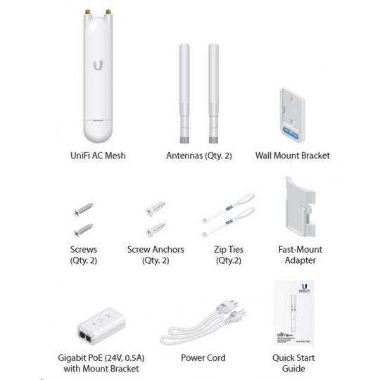 uniFi AP AC Mesh je vonkajší vodotesný sieťový prístupový bod s celkovou priepustnosťou až 1167 Mb/s (2.4GHz 300Mbps + 5GHz 867Mbps), má všesmerové dvojpásmové pripojenie 2x2MIMO. 3dBi (4dBi pre 5GHz) anténa s rádiovým výkonom 20dBm pre 2,4 aj 5GHz súčasne. Podporuje 802.11a/b/g/n/ac, má jeden gigabit.ethernet. prístav. Môže byť napájaný prostredníctvom aktívneho PoE podľa 802.3af alebo pasívne (24 V DC), PoE adaptér je súčasťou dodávky (pasívne). Maximálna spotreba energie je 8,5 W.