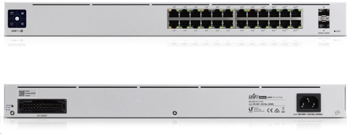 Dvojica portov 10G SFP+ so spätnou kompatibilitou s 1G SFP slúži ako Uplink. V prípade výpadku napájania alebo interného výpadku napájania možno prepínač pripojiť k záložnému systému UniFi SmartPower, ktorý môže podporovať až 6 podporovaných zariadení.