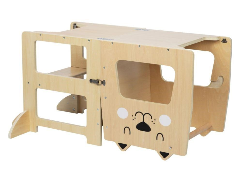 Viacúčelová učiaaca veža 4v1 je nepostrádateľným pomocníkom v domácnosti s malými deťmi. Učiaca veža Lev predstavuje detský nábytok aj hračku v jednom a poteší dievčatá aj chlapcov. Môže byť bežnou učiaacou vežou v podobe roztomilého zvieratka, môže predstavovať schody, originálny set detského nábytku (detský stolík so stoličkou) a zároveň je aj kresliaca tabuľa, na ktorú si deti môžu maľovať kriedami.