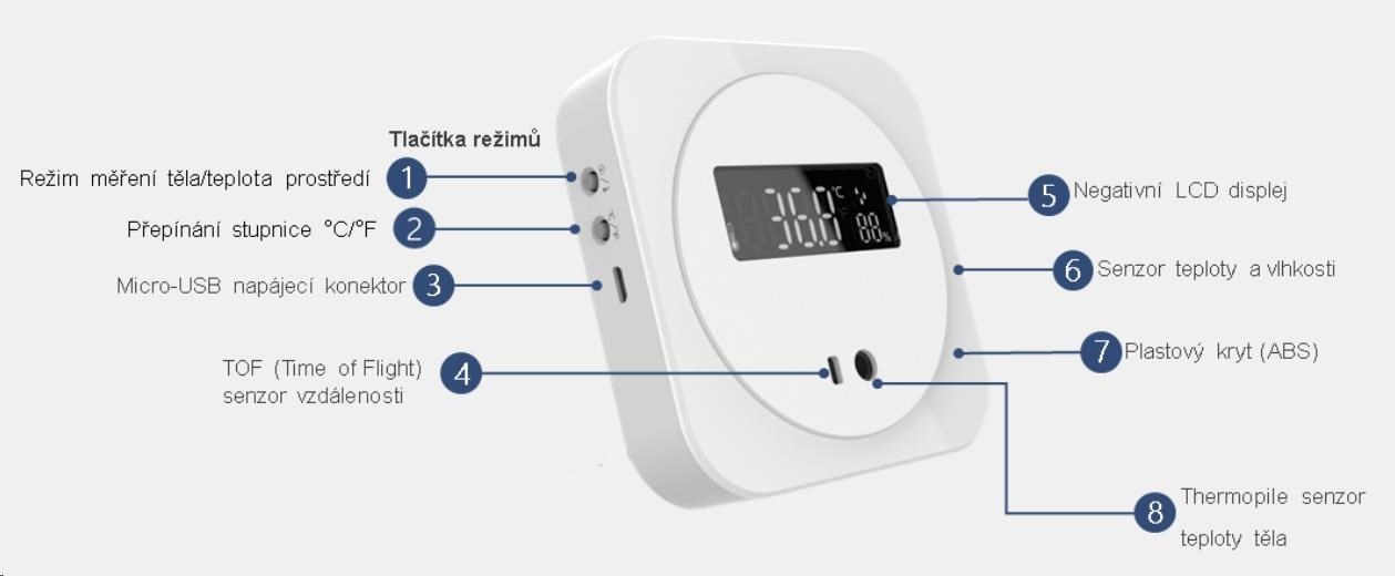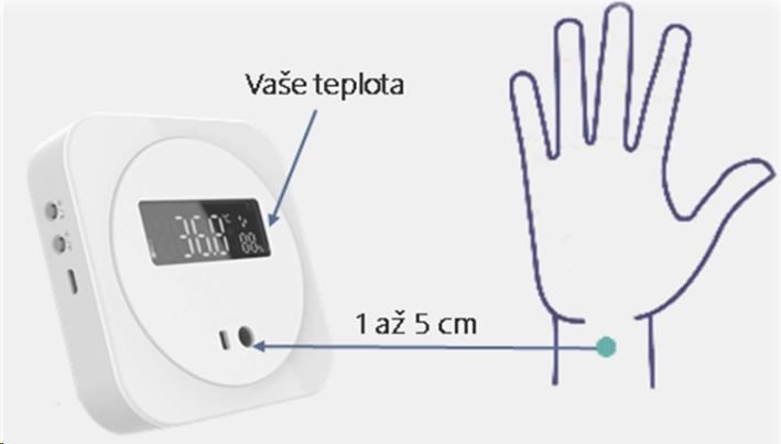OHE-TWP02-D je veľmi jednoduché zariadenie, ktoré sa používa na rýchle orientačné meranie teploty na zápästí. Terminál je možné prevádzkovať v troch rôznych režimoch prevádzky - Automatický - Režim merania teploty a vlhkosti prostredia - Režim merania telesnej teploty. Terminál má dva snímače teploty a jeden snímač vlhkosti na zabezpečenie správnej funkčnosti. Ak je zvolený automatický režim, terminál sa okamžite prepne, ak sa vyžaduje meranie telesnej teploty na základe integrovaného snímača ToF (Time of Flight). Senzor ToF detekuje spektrum infračerveného žiarenia vyžarovaného z povrchu ľudského tela. OHE-TWP02-D-S31 je určený pre vnútorné aplikácie s nízkym počtom osôb, ako sú obce, kancelárie, domácnosti atď. Môže sa prevádzkovať len vo vnútornom tepelne a emisne stabilnom prostredí mimo prievanu a poveternostných podmienok. Nie je určený na meranie osôb bezprostredne po príchode z vonkajších priestorov (z veľmi chladných alebo teplých oblastí). V prípade príchodu z vonkajších priestorov sa odporúča počkať 1 minútu v miestnosti s terminálom, aby sa stabilizovala teplota povrchu tela. Zariadenie nemá pravidelnú automatickú rekalibráciu snímača s okolitým prostredím. Preto nemôže nahradiť profesionálne vstupné systémy s meraním teploty. Zariadenie sa dodáva bez napájania USB, iba s napájacím káblom microUSB-USB...