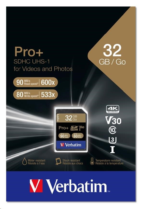 Karta VERBATIM SDHC 32GB PRO+ Class 10, UHS-1 (R:90/W:80 MB/s)