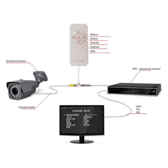 UTC OSD ovládač pre ekonomické typy kamier bez OSD ovládača, ktorý umožňuje jednoduché nastavenie analógových kamier zo strany záznamového zariadenia. Nie je potrebné pristupovať ku každej kamere a nastavovať voľby ako BLC, WDR na strane kamery. Zariadenie podporuje len vybrané typy kamier prevažne kompatibilné s kamerami využívajúcimi čip Sony 700tvl.