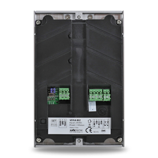 Vstupná kamerová jednotka VERIA 802 je určená pre 2-vodičové systémy domácich videotelefonov VERIA séria 2-WIRE. Vstupná farebná kamerová jednotka VERIA 802 v elegantnom kovovom anti-vandal prevedení určená pre domáce videotelefony VERIA.