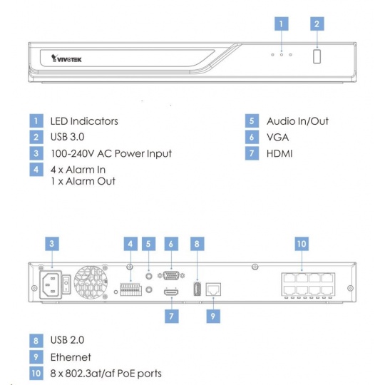 NVR umožňuje vstup až z 8 kanálov (kamery, videoservery). Podporuje rozlíšenie 8 MPx alebo 4K UHD pri maximálnej šírke pásma 64 Mb/s. Na výstup, ktorý možno realizovať až do rozlíšenia 4K, môžete použiť rozhranie HDMI, k dispozícii je aj výstup VGA (max. FullHD). Jednou z hlavných výhod tohto modelu je možnosť napájania až 8 kamier prostredníctvom siete Ethernet. K dispozícii je osem portov s funkciou PoE (celkovo max. 120 W), ktoré sú v súlade s normou 802.3af a 802.3at. Pomocou správy PoE cez webové rozhranie môže používateľ vidieť spotrebu energie každej kamery a reštartovať ju.