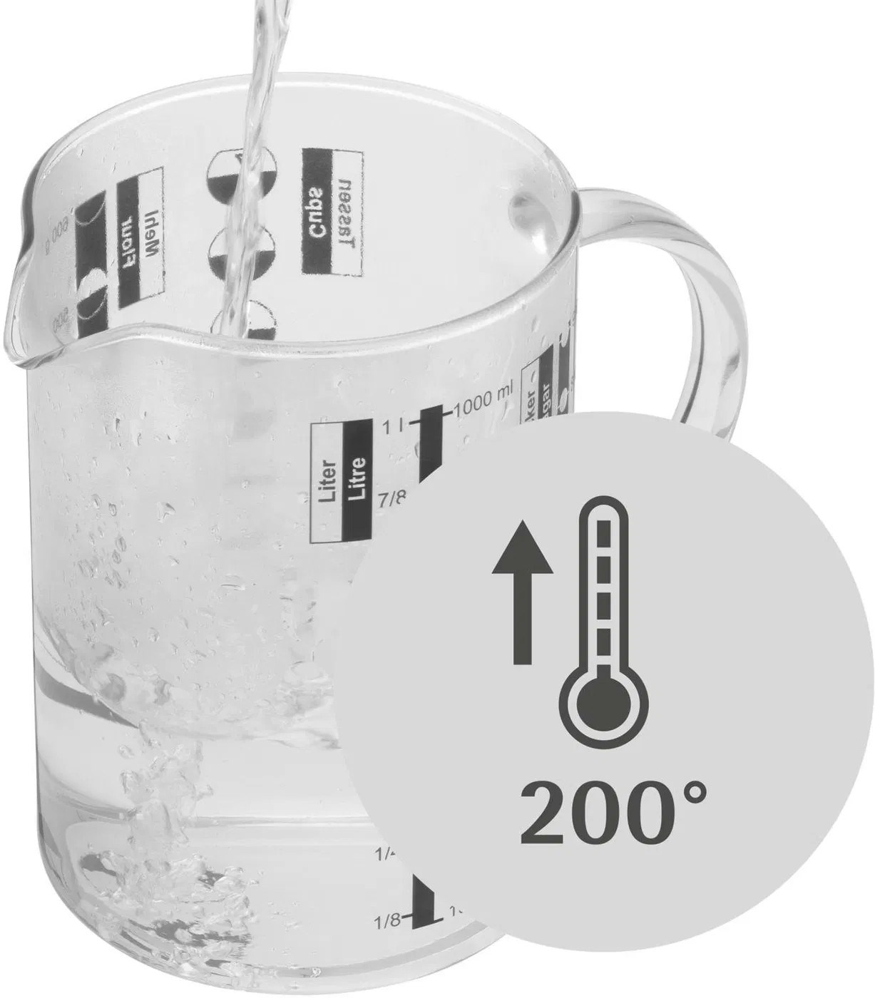 - Tepelne odolné sklo: Vyrobené z odolného borosilikátového skla, ktoré znáša vysoké teploty, čo umožňuje odmeriavanie horúcich tekutín.