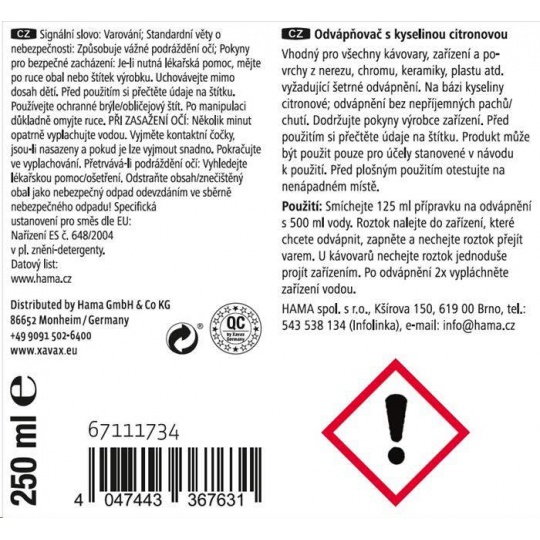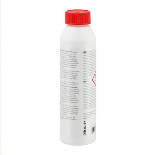 - prípravok na rýchle odvápnenie - vhodný pre všetky zariadenia na prípravu čaju, kávy, pressa, kapslové kávovary, aj plne automatické kávovary, varné kanvice, rýchlovarné konvice, ponorné variče, hrnce, nerezové hrnce a panvice, drezy, povrchy z nerezovej ocele, chrómu, keramiky a plastu atď., ktoré vyžadujú šetrné odvápnenie - na báze kyseliny citrónovej: odvápnenie bez nepríjemných pachov/chutí - bezpečnostný uzáver proti náhodnému otvoreniu deťmi - objem: 250 ml - vyrobené v Nemecku Upozornenie: Dodržiavajte pokyny výrobcu zariadenia. Pred použitím si prečítajte údaje na štítku. Pred plošným použitím otestujte na nenápadnom mieste. Použitie: Zmiešajte 125 ml prípravku na odvápnenie s 500 ml vody. Roztok nalejte do zariadenia, ktoré chcete odvápniť, zapnite a nechajte roztok prejsť varením. Pri kávovaroch nechajte roztok jednoducho pretiecť zariadením. Po odvápnení 2x vypláchnite zariadenie vodou.