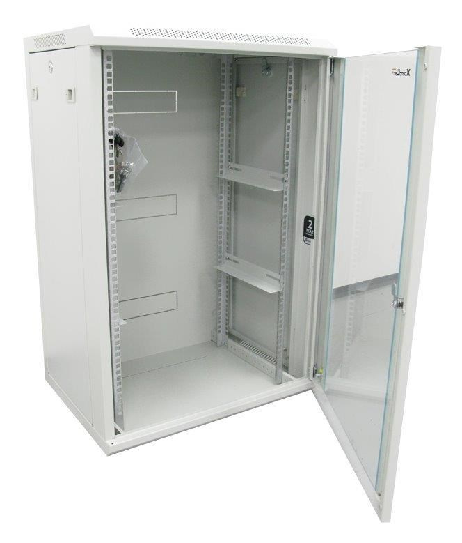XtendLan 19" nástěnný rozvaděč 22U 600x450, nosnost 60 kg, skleněné dveře, svařovaný, šedý