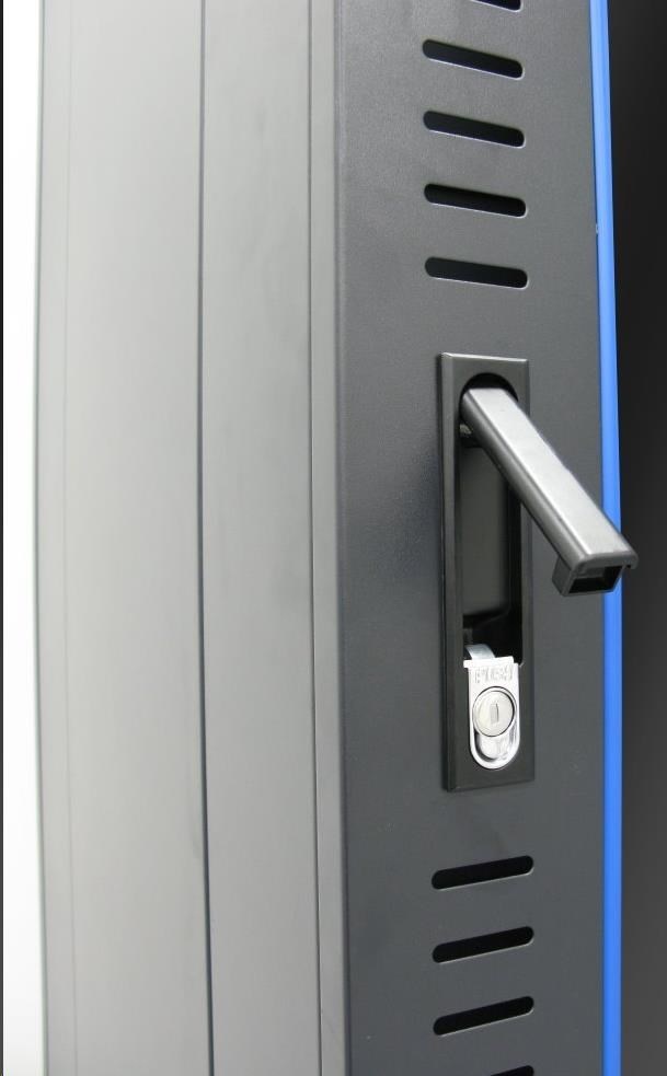 Rozvádzače sú výborné remeselne spracované. Vyrobené sú z válcovanej ocele, nosné časti sú z ocele hrúbky 2 mm, ostatné časti z 1,5 mm ocele. Pevná konštrukcia umožňuje statickú záťaž až 5800 kg. Zamykateľné predné a zadné dvere, rukou uzamykané a voliteľne zamykateľné bočné panely. Dodáva sa s nohami, kolieskami a montážnou sadou. Je možné pridať podstavec. Kolieska aj nohy je možné nainštalovať súčasne a zabezpečiť tak stabilnú inštaláciu, ktorú je možné v prípade potreby ľahko premiestniť. Uvedenie: dvere - bezpečnostné sklo, zamykateľné zadný kryt - úplný, zamykateľný bočný kryt - úplný, možno vybaviť zámkom