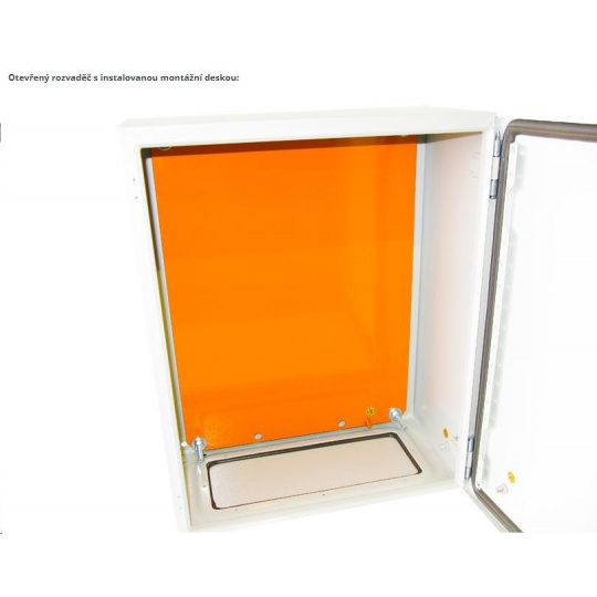 Rozvadeč je vyrobený z valcovanej ocele o hrúbke 1,5 mm. Štandardy: IEC60529, EN60529/10.91, GB4208-93 Vyhotovenie: dvere - plné, otvárateľné o 110 stupňov, montáž pravá alebo ľavá (používateľsky výmenné otváranie) základná krytina - plná bočný kryt - plný horný kryt - plný montážna doska: