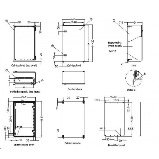 Univerzálny rozvádzač, IP66, oceľový, šedý. Trojvrstvová povrchová úprava (fosfátovanie, máčanie v základnom laku, práškový lak), výmenné dvere, pevná konštrukcia. Odnímateľný kryt káblového priechodu. Rozvádzač je vyrobený z valcovej ocele s hrúbkou 1,5 mm. Standardy: IEC60529, EN60529/10.91, GB4208-93 Vyhotovenie: dvere - plné, otvárateľné o 110 stupňov, montáž pravá alebo ľavá (užívateľsky meniteľné otváranie) zadný kryt - plný bočný kryt - plný horný kryt - plný montážna doska: