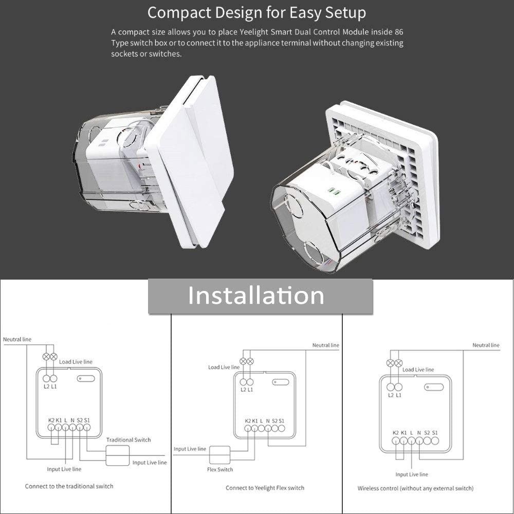 Kompaktné rozmery umožňujú umiestniť inteligentný duálny riadiaci modul do spínacej skrinky alebo pripojiť k miestu inštalácie ovládacieho panela alebo stropného svetla bez výmeny existujúcich zásuviek a konektorov. Vďaka tomu je konfigurácia reléového modulu Yeelight mimoriadne jednoduchá.