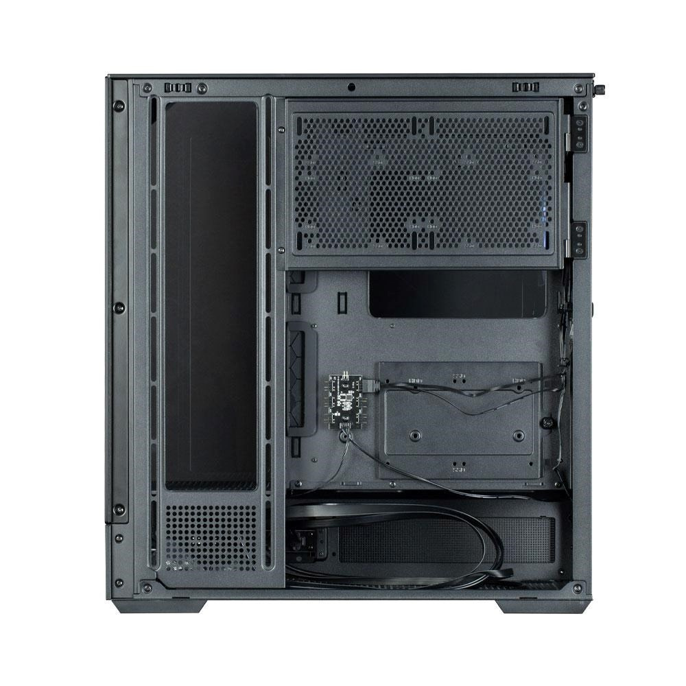 Pocitovo odstráni rám skrine a poskytuje pocit otvorenosti a voľného výhľadu. Panely z tvrdeného skla na prednej strane, stranách a hornej časti vytvárajú dokonalý vzhľad.