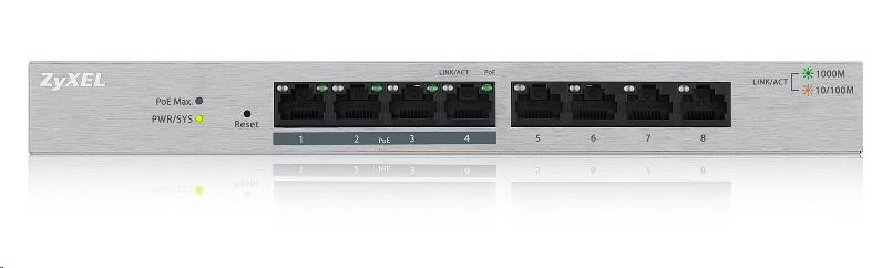Zyxel GS1200-8HP 8-portový gigabitový webový inteligentný prepínač, 4x PoE 802.3at, PoE rozpočet 60W, bez ventilátora