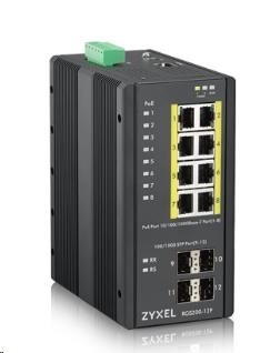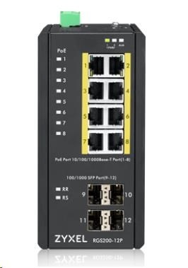Zyxel RGS200-12P 12-portový gigabitový WebManaged PoE switch, 8x GbE + 4x SFP, rozpočet PoE 240W, montáž na DIN lištu/na stenu, IP30